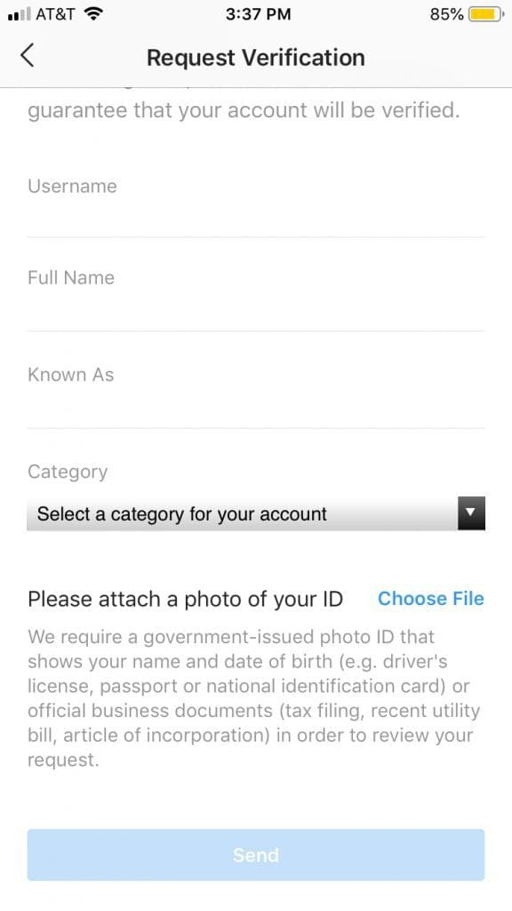 STEP 3: Fill out the information requested to fill Instagram verification form, including: your account name, full name, photo of your ID (if you’re a personal account), or an official business ID (if you’re an Instagram Business account)