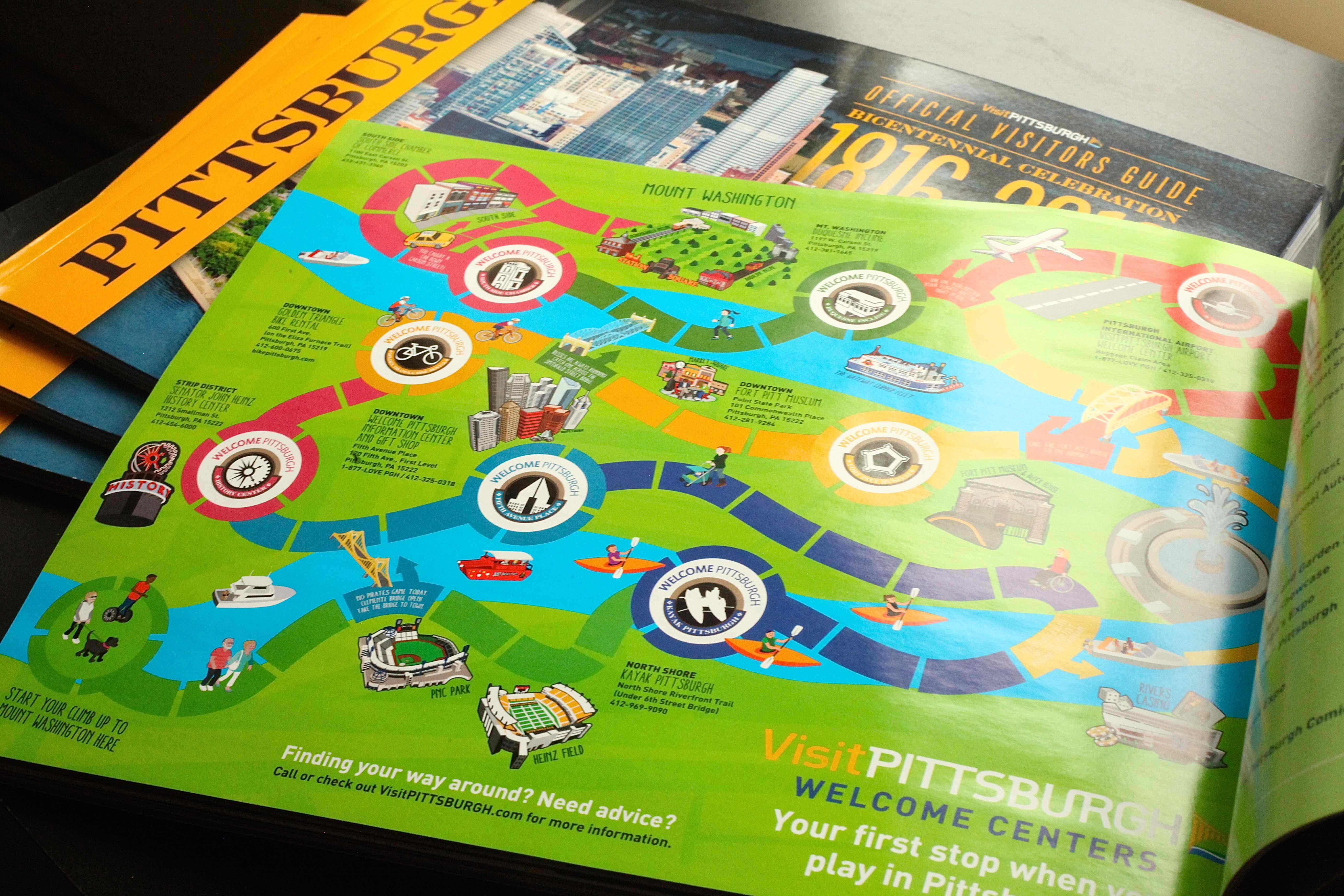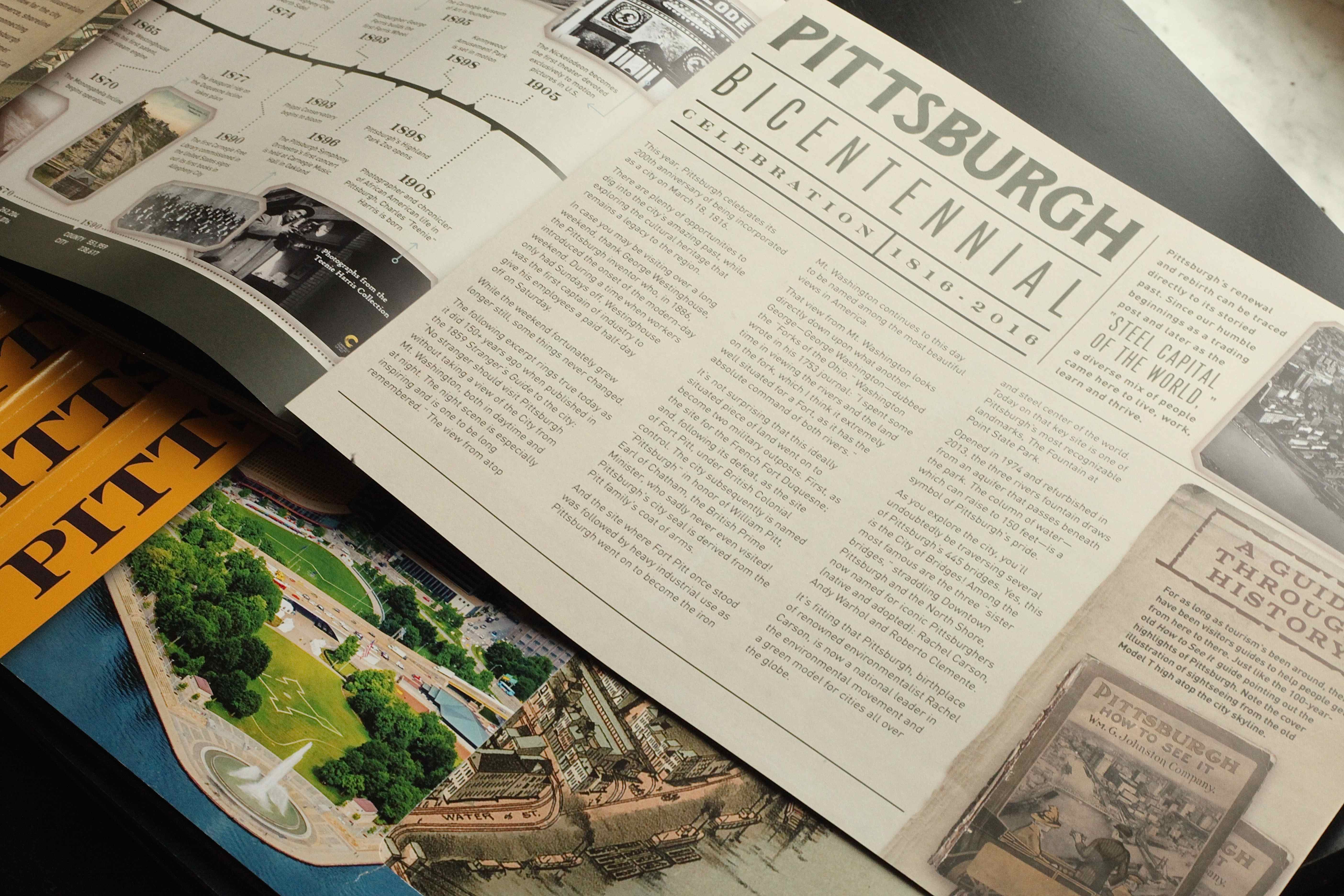 Prizum Creative has been working with Visit Pittsburgh for the last four years to complete their annual Visitors Guide. For this year’s publication design, Visit Pittsburgh wanted to focus on celebrating Pittsburgh’s bicentennial. This guidance opened a window of opportunity for Prizum Creative to design a unique publication that not only captured the particular theme Visit Pittsburgh wanted for the 2016 Guide, but also still met their yearly goal of being a “one-stop shop” for visitors planning a trip to Pittsburgh.